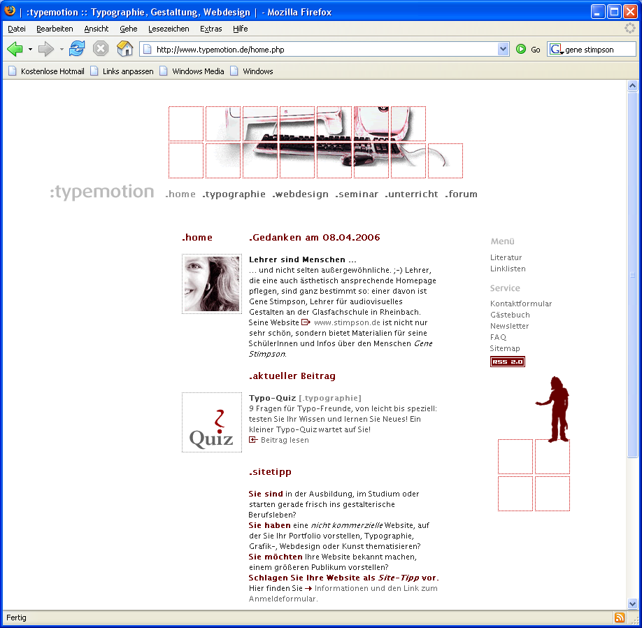 Die letzte Site hatte immerhin acht Jahre lang nur inhaltliche Veränderungen erlebt, denn wer sich hauptberuflich um die Ausbildung von Webdesignern und die Betreuung von Website-Kunden kümmert, hat meist keine Zeit mehr für die eigene Site. So hatte das alte Layout noch alle klassischen Features, die heute als vermeidbare Probleme gelten, insbesondere keine strikte Trennung von Inhalt und Layout, Tabellenlayouts und Framesets.